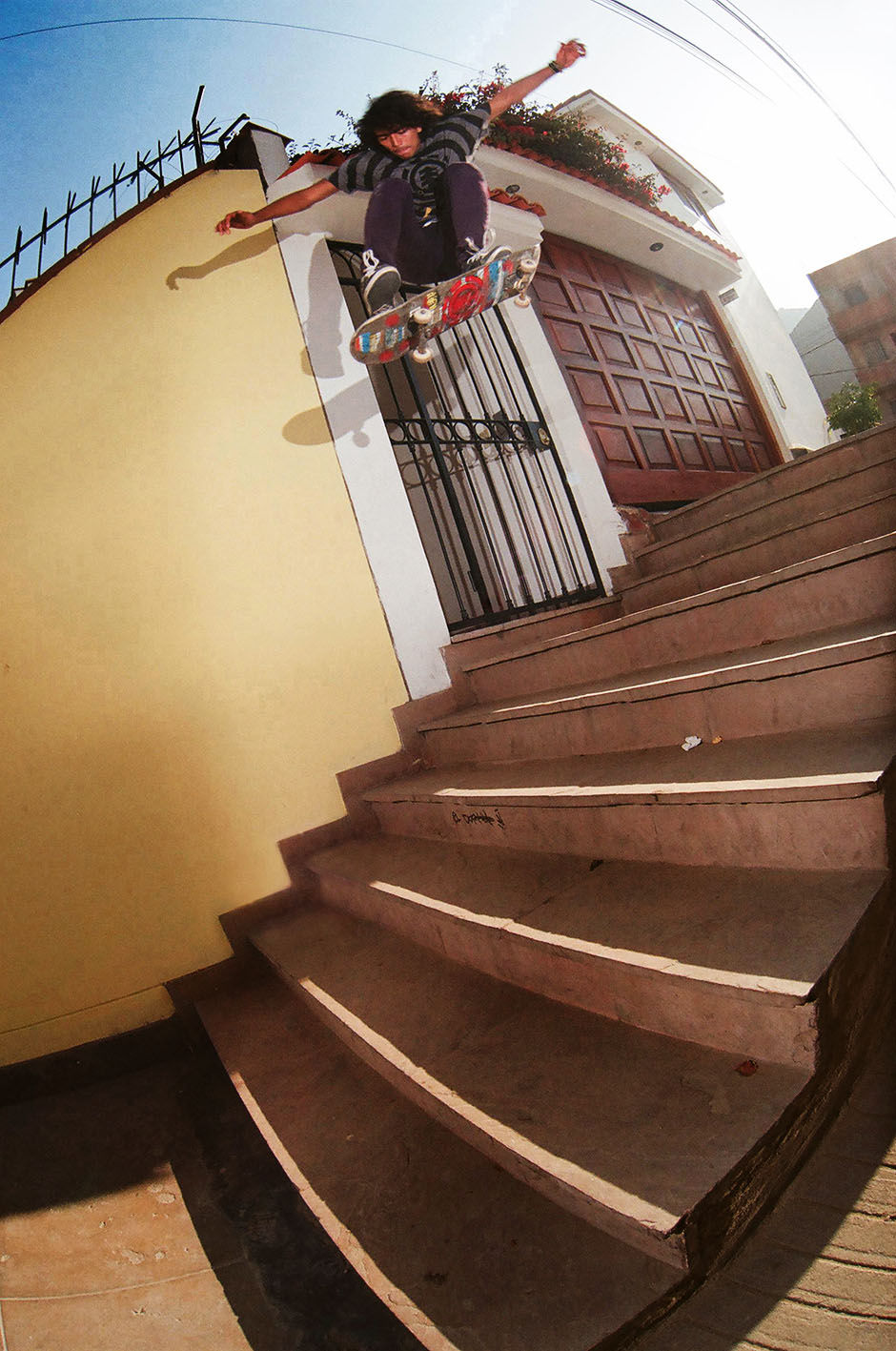 Eso fue historia de 2 días. La primera vez que me hablaron de ese spot me dijeron que habían encontrado un gap de cancha a cancha donde se le podían dar trucos, me empilé y les dije a los de Escoria para ir. Fuimos y cuando llegamos la verdad no había encontrado ningún spot. Luego me dijeron “ese es el spot” y lo que pensé fue que era un espacio imposible de saltar. Hice ir a la gente por las huevas. Pero también pensé, antes de quitarme voy a pulsear un ollie, total si no llego caigo en pasto. Me mandé y llegué al otro lado. Si se puede entonces! Y ese día hice ollie. Después de facil 6 meses, aún no tenía mi cerrador para la Escoria y estaba viendo, como de costumbre, el Emerica “This is skateboarding” Me acuerdo clarito que en plena parte de Austin Stephens me empilé tanto que llamé a Ignaico y Lelo y les dije que quiero hacer backside ahí. Nos fuimos con todo y traté primero ollie, pero no podía. Me estaba desesperando porque había ido por el backside. Al rato dije, Al Carajo me mando defrente en backside nomas. Y sin querer me salió en creo que 5 intentos. Me cagaba de miedo pero valió la pena.